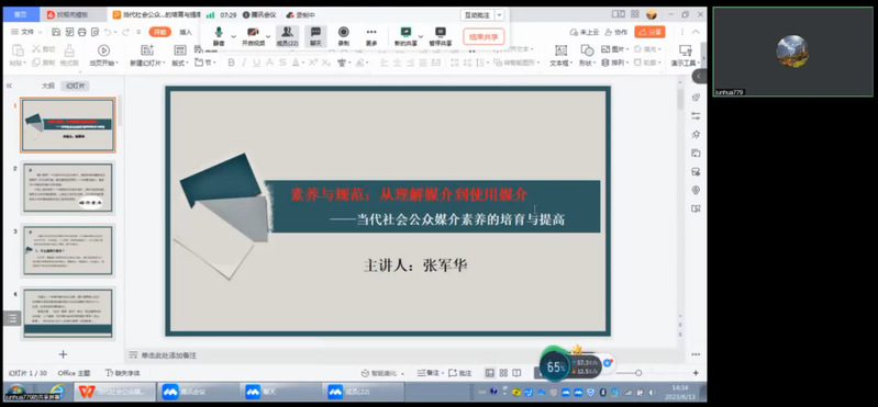 广东财经大学硕导张军华教授以“媒介素养”为中心,逻辑清晰地向各位硕士研究生阐述了何为媒介素养、媒介素养的四个阶段以及其特点、当代社会中媒介素养的重要性、如何培育和提高当代社会公众的媒介素养等问题。他认为在如今以流量、数据和算法为王的媒体时代中,提高公众的媒介素养,将对社会的健康发展起到重大的意义。