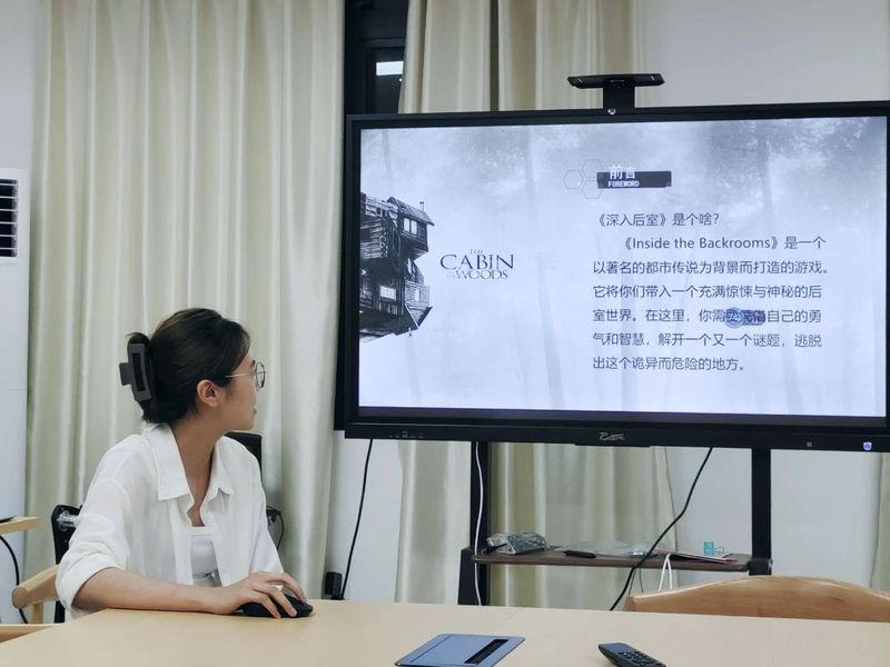 除影视鉴赏外,出版专业的杨子琪同学还为大家带来一款游戏《Inside the backrooms》的讲解,这是一个以著名的都市传说为背景而打造的游戏,让玩家进入一个充满惊悚与神秘的后室世界。游戏中提到后室理论:这个一个略带倾斜的走廊,黄色的壁纸,潮湿的地毯散发出发霉的味道,还有嗡嗡作响的荧光灯。“人们有可能会在错误的地点脱离现实,然后进入这个空间,并且被永远困住”。杨同学详细介绍了游戏中的场景、角色设定和谜题设计,并强调玩家需要凭借自己的勇气和智慧来解开一个个谜题并成功逃脱。