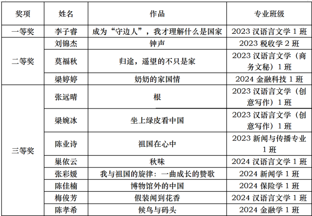 广东财经大学第三届“同心杯”征文创作比赛于近期完成作品评审。本届“同心杯”赛事以“我和我的祖国”为主题,目的是迎接新中国成立75周年,加强校园文化建设,增强学生爱国情感和民族自信心。比赛于9月初启动,共收获150余份参赛稿件。经过严谨、公正的评审,共评出一等奖1名,二等奖3名,三等奖8名,优秀奖21名。
