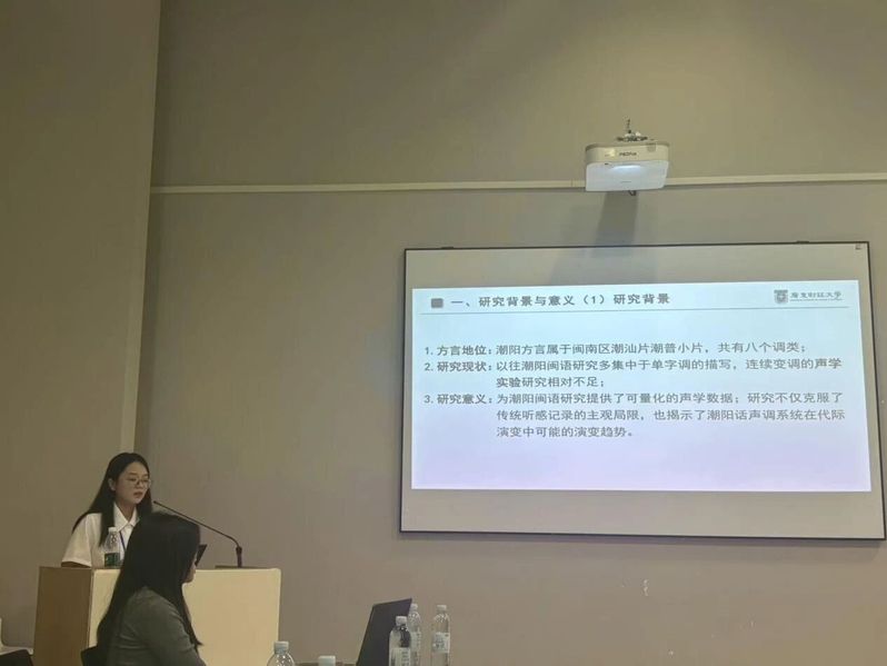 在会上,陈洁仪同学作了题为《潮阳闽语二字组连续变调声学实验研究》的学术报告。该报告采用声学实验的研究方法,对潮阳闽语的连续变调进行了代际比较研究,为潮阳闽语未来的可能演变路径提供了新的观察视角。报告内容获得了与会专家学者的高度认可,多位专家对该报告的研究思路的创新和研究方法的科学给予了高度评价,并对我院中文系本科生的科研水平表示高度赞赏。
